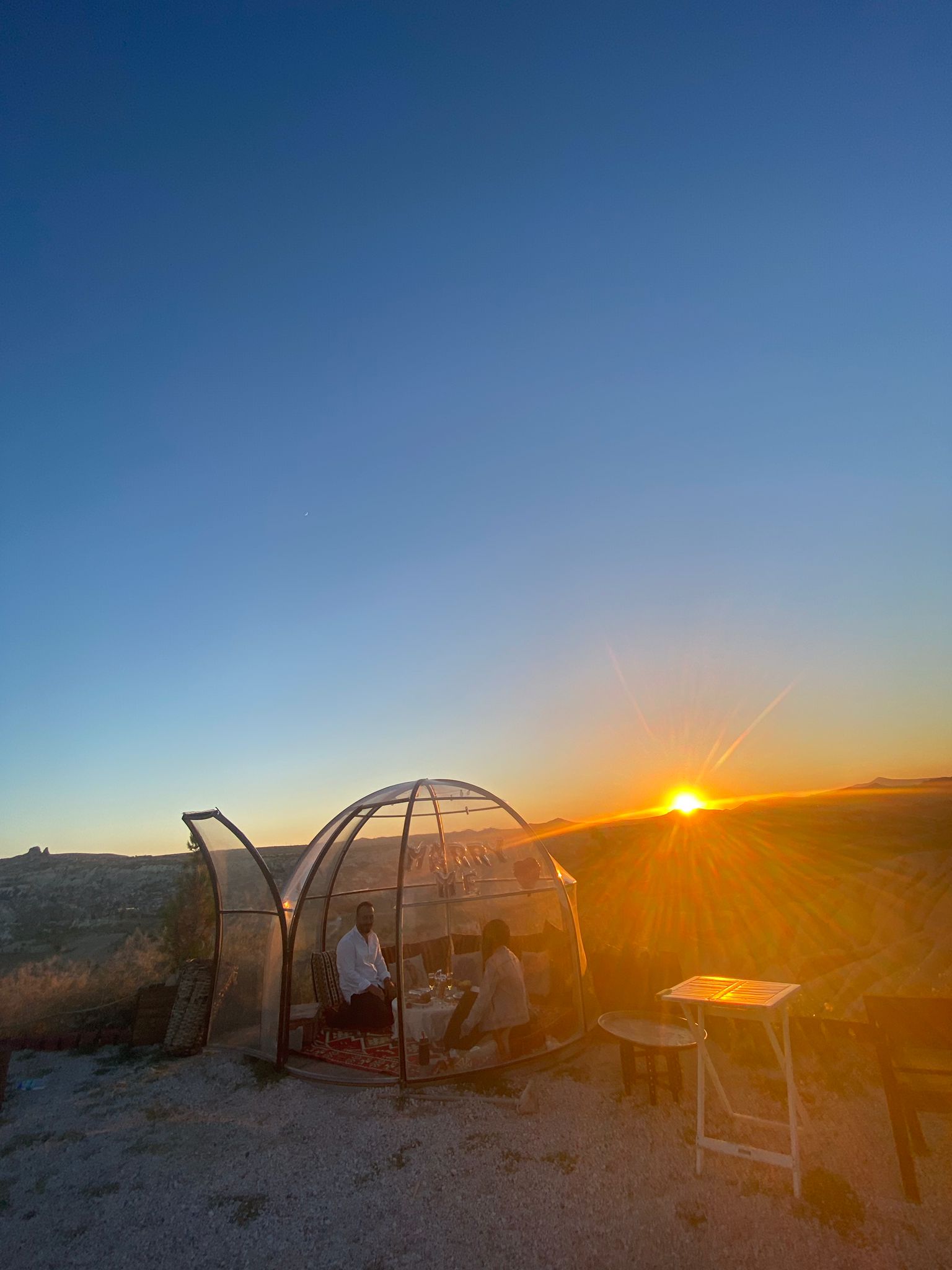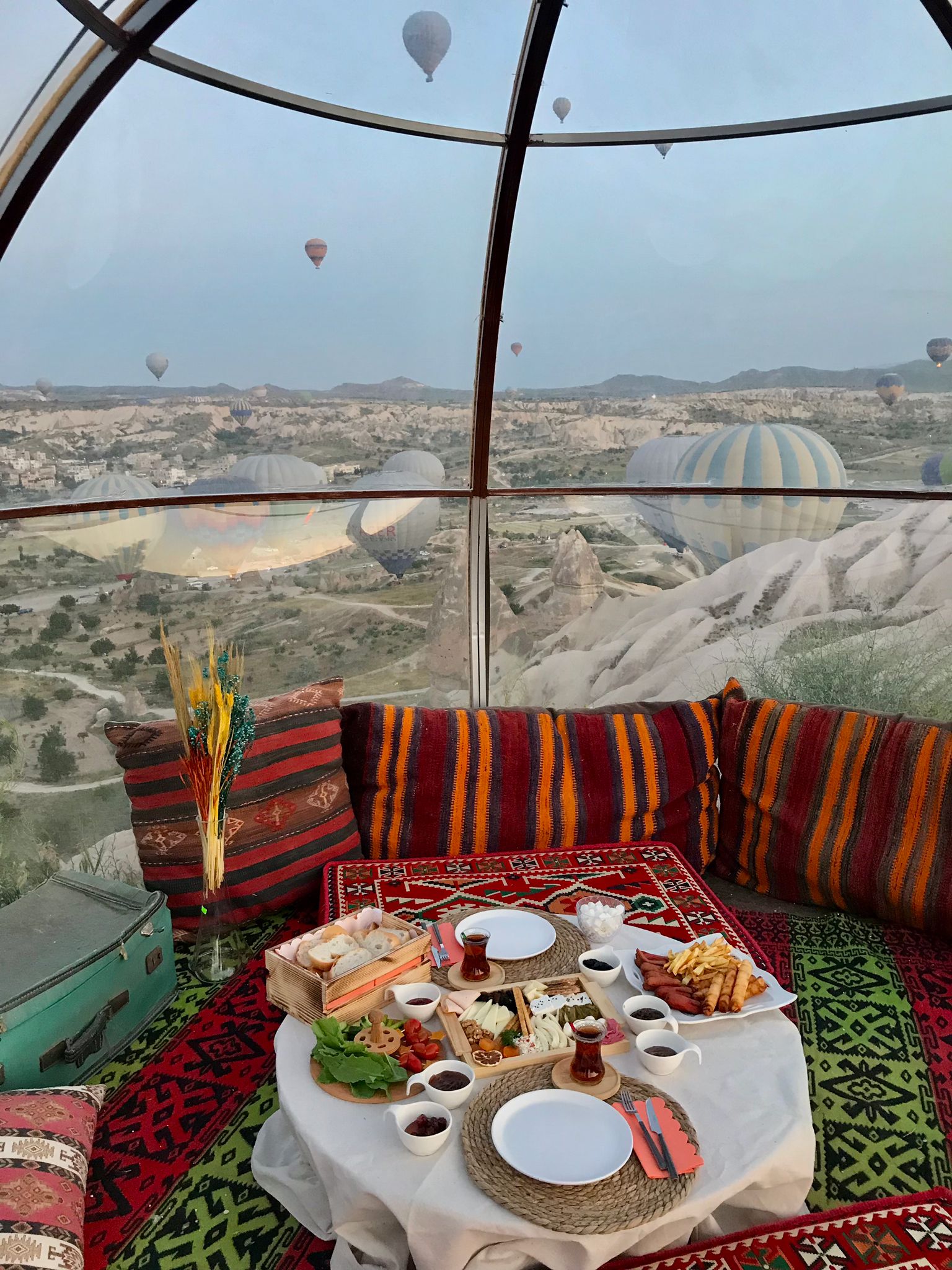 Enjoy the landscape and local wine & cheese by having a picnic on a traditionally prepared floor table in the most beautiful panoramic spots of Cappadocia. You can be a couple, with your family or friends or just for yourself, we prepare this picnic at any time according to your demands. When you want to have your breakfast with the balloons above you at sunrise or to drink your red wine at sunset, we will set up your floor table in the best location. A comfortable seating area consisting of Turkish handmade carpets & cushions, mezes, alcoholic or non-alcoholic drinks will be prepared according to the time you choose. It will be specially prepared for you to make a romantic marriage proposal, to celebrate your birthday, wedding anniversary, other special days or just to enjoy that moment. If you have requests such as cake, musician, flower, photographer, you can specify during the reservation.